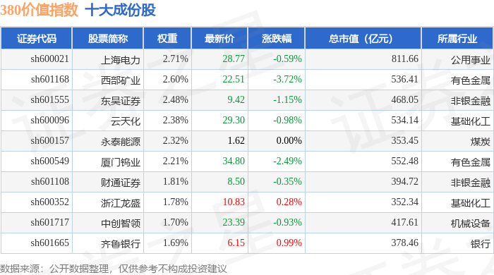 380价值(000118)指数十大成份股详情如下: