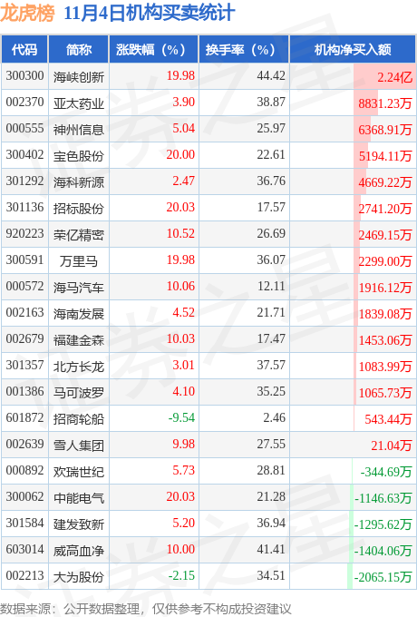 当日公布的交易所龙虎榜中有机构专用席位现身的个股共27家,其中海峡创新以净买入2.24亿元排名第一。详情见下表: