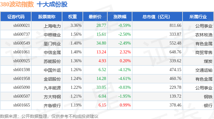 证券之星消息,11月4日,380波动(000130)指数报收于13622.18点,跌0.41%,成交297.59亿元,换手率1.27%。当日该指数成份股中,上涨的有30家,厦门银行以5.92%的涨幅领涨,下跌的有63家,扬农化工以7.14%的跌幅领跌。