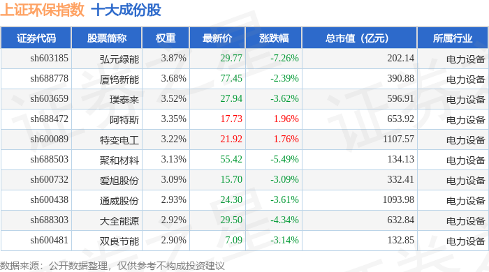 证券之星消息,11月4日,上证环保(000158)指数报收于1384.56点,跌1.74%,成交453.8亿元,换手率1.31%。当日该指数成份股中,上涨的有9家,奥特维以2.32%的涨幅领涨,下跌的有29家,弘元绿能以7.26%的跌幅领跌。