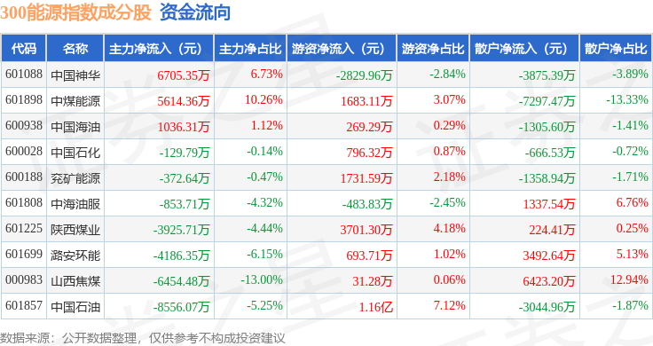 资金流向方面,300能源(000908)指数成份股当日主力资金净流出合计1.11亿元,游资资金净流入合计1.72亿元,散户资金净流出合计6071.11万元。成份股资金流向详情见下表: