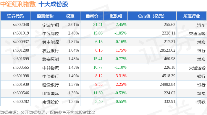 中证红利(000922)指数十大成份股详情如下: