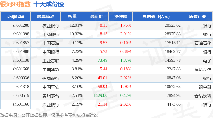 证券之星消息,11月4日,银河99(000959)指数报收于8236.29点,涨0.46%,成交2703.91亿元,换手率0.44%。当日该指数成份股中,上涨的有35家,中微公司以5.38%的涨幅领涨,下跌的有62家,阳光电源以6.16%的跌幅领跌。