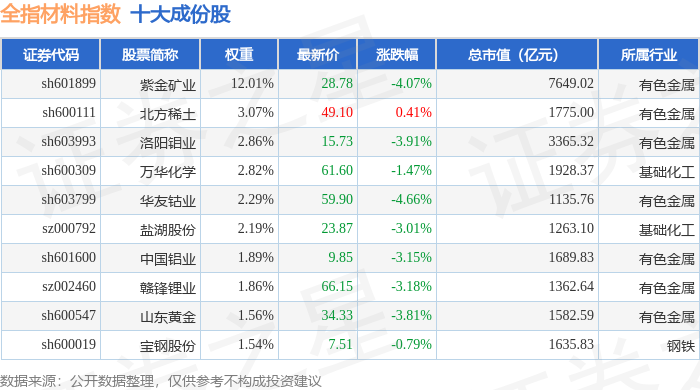 证券之星消息,11月4日,全指材料(000987)指数报收于4426.73点,跌2.53%,成交1380.75亿元,换手率2.01%。当日该指数成份股中,上涨的有14家,包钢股份以5.26%的涨幅领涨,下跌的有146家,国城矿业以10.01%的跌幅领跌。