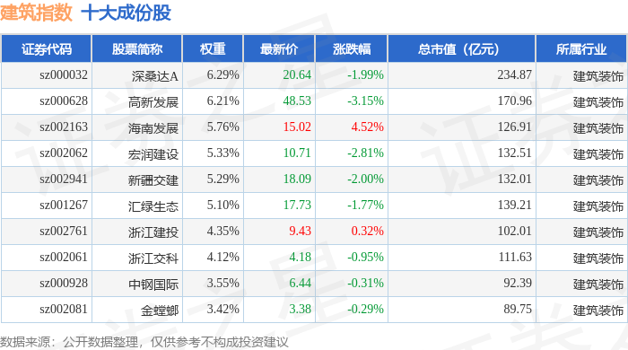 资金流向方面,建筑指数(399235)成份股当日主力资金净流出合计6.56亿元,游资资金净流入合计1.82亿元,散户资金净流入合计4.75亿元。成份股资金流向详情见下表: