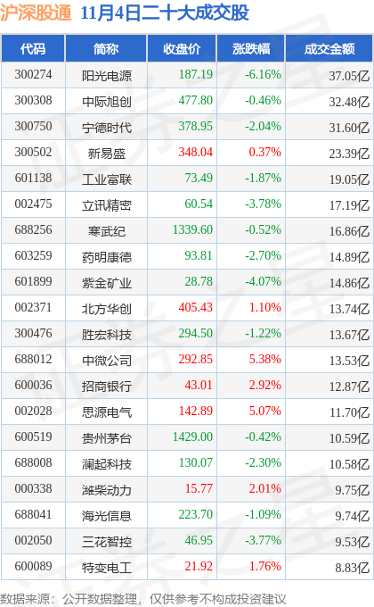 当日北向资金余额额度充足,振华股份(603067)领涨,涨幅10.0%,交易所公布的沪深股通二十大成交股中成交额前三的为阳光电源、中际旭创、宁德时代,成交额分别为37.05亿元、32.48亿元、31.6亿元。详情可见下表:
