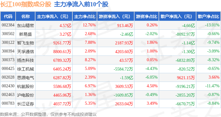 资金流向方面,长江100(399278)指数成份股当日主力资金净流出合计110.43亿元,游资资金净流入合计30.12亿元,散户资金净流入合计80.31亿元。成份股资金流向详情见下表: