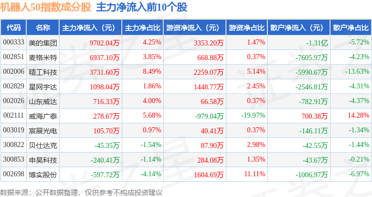 资金流向方面,机器人50(399283)指数成份股当日主力资金净流出合计42.62亿元,游资资金净流入合计12.07亿元,散户资金净流入合计30.55亿元。成份股资金流向详情见下表: