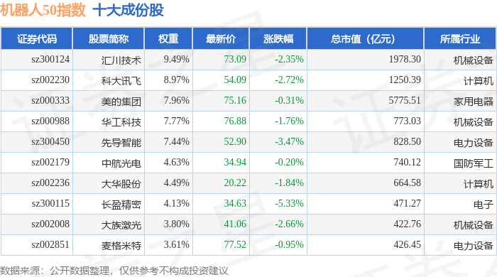 机器人50(399283)指数十大成份股详情如下: