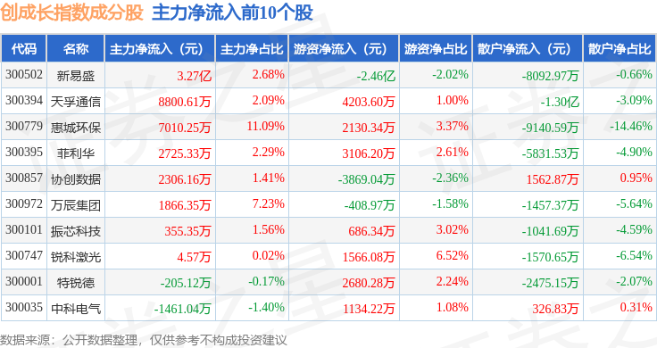 资金流向方面,创成长(399296)指数成份股当日主力资金净流出合计82.95亿元,游资资金净流入合计25.24亿元,散户资金净流入合计57.71亿元。成份股资金流向详情见下表: