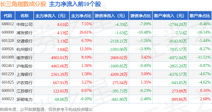 资金流向方面,长三角(399355)指数成份股当日主力资金净流出合计39.41亿元,游资资金净流入合计10.7亿元,散户资金净流入合计28.71亿元。成份股资金流向详情见下表: