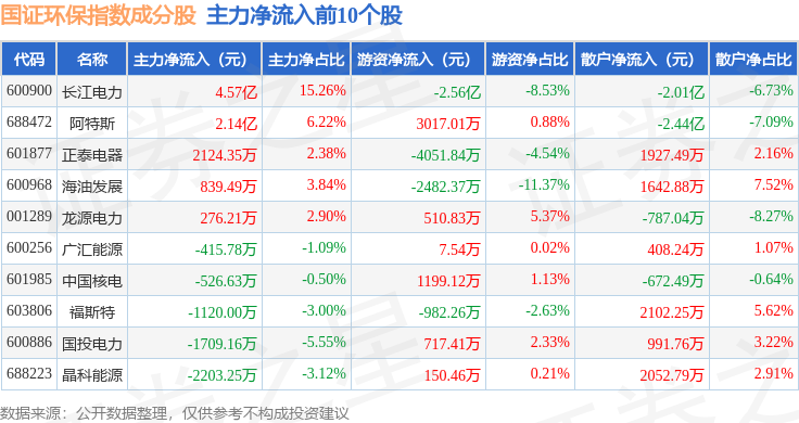 资金流向方面,国证环保(399358)指数成份股当日主力资金净流出合计93.21亿元,游资资金净流入合计29.12亿元,散户资金净流入合计64.09亿元。成份股资金流向详情见下表: