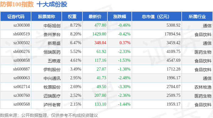 防御100(399403)指数十大成份股详情如下: