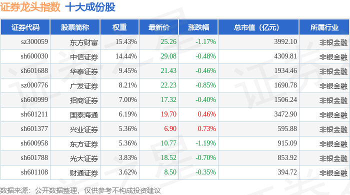 证券之星消息,11月4日,证券龙头(399437)指数报收于6932.04点,跌0.57%,成交241.17亿元,换手率0.83%。当日该指数成份股中,上涨的有4家,兴业证券以0.73%的涨幅领涨,下跌的有25家,东兴证券以1.41%的跌幅领跌。