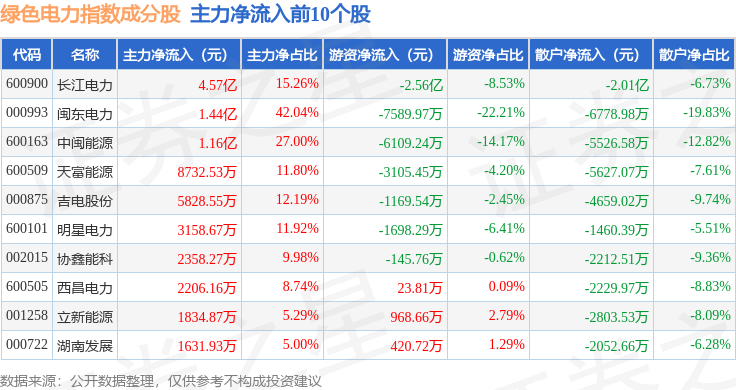 资金流向方面,绿色电力(399438)指数成份股当日主力资金净流入合计1.02亿元,游资资金净流出合计2.91亿元,散户资金净流入合计1.89亿元。成份股资金流向详情见下表:
