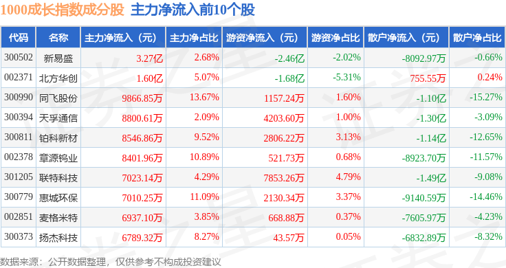 资金流向方面,1000成长(399630)指数成份股当日主力资金净流出合计242.38亿元,游资资金净流入合计62.59亿元,散户资金净流入合计179.79亿元。成份股资金流向详情见下表: