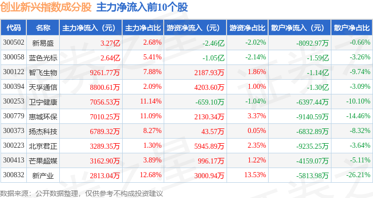 资金流向方面,创业新兴(399643)指数成份股当日主力资金净流出合计133.55亿元,游资资金净流入合计43.97亿元,散户资金净流入合计89.58亿元。成份股资金流向详情见下表:
