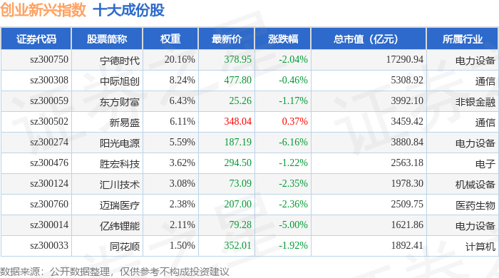 证券之星消息,11月4日,创业新兴(399643)指数报收于3859.61点,跌1.97%,成交1806.89亿元,换手率2.96%。当日该指数成份股中,上涨的有13家,蓝色光标以3.69%的涨幅领涨,下跌的有86家,阳光电源以6.16%的跌幅领跌。