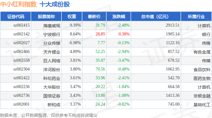 证券之星消息,11月4日,中小红利(399649)指数报收于3246.8点,跌1.17%,成交323.65亿元,换手率1.15%。当日该指数成份股中,上涨的有15家,三七互娱以2.58%的涨幅领涨,下跌的有34家,龙佰集团以4.16%的跌幅领跌。