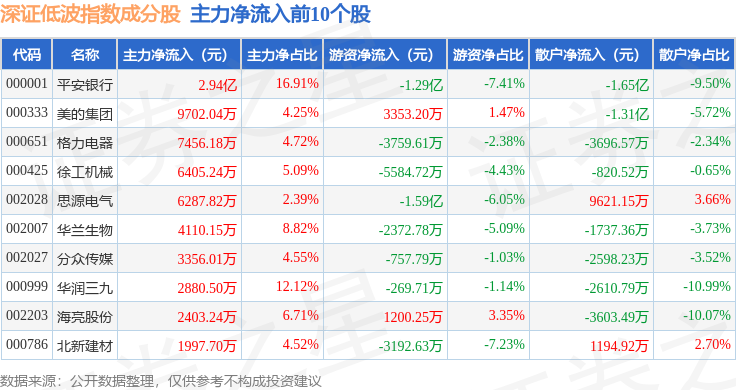 资金流向方面,深证低波(399661)指数成份股当日主力资金净流出合计39.27亿元,游资资金净流入合计11.73亿元,散户资金净流入合计27.53亿元。成份股资金流向详情见下表:
