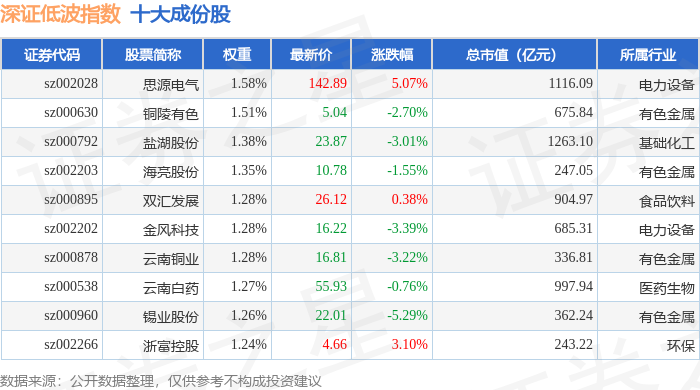证券之星消息,11月4日,深证低波(399661)指数报收于5862.0点,跌0.96%,成交627.79亿元,换手率0.98%。当日该指数成份股中,上涨的有20家,思源电气以5.07%的涨幅领涨,下跌的有77家,锡业股份以5.29%的跌幅领跌。