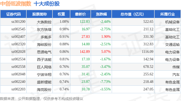 中创低波(399665)指数十大成份股详情如下: