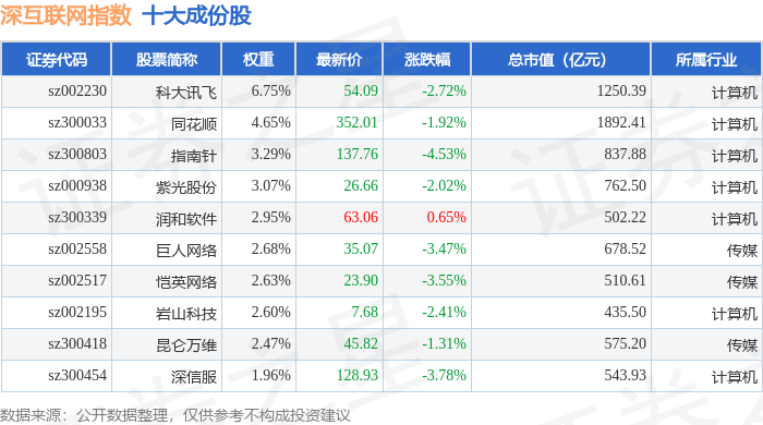 证券之星消息,11月4日,深互联网(399675)指数报收于3595.75点,跌1.43%,成交854.37亿元,换手率4.0%。当日该指数成份股中,上涨的有46家,恒实科技以7.67%的涨幅领涨,下跌的有115家,达实智能以9.94%的跌幅领跌。