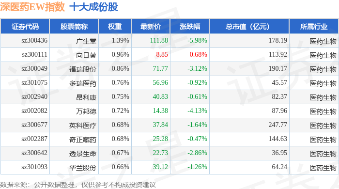 证券之星消息,11月4日,深医药EW(399676)指数报收于3899.34点,跌1.29%,成交601.49亿元,换手率2.35%。当日该指数成份股中,上涨的有50家,华兰疫苗以11.75%的涨幅领涨,下跌的有159家,常山药业以20.0%的跌幅领跌。