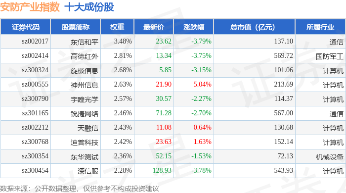 证券之星消息,11月4日,安防产业(399693)指数报收于5037.11点,跌1.35%,成交328.24亿元,换手率3.44%。当日该指数成份股中,上涨的有10家,神州信息以5.04%的涨幅领涨,下跌的有40家,达实智能以9.94%的跌幅领跌。