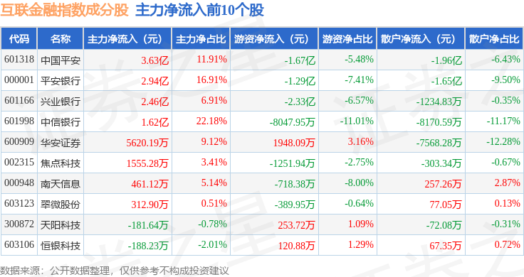 资金流向方面,互联金融(399805)指数成份股当日主力资金净流出合计27.22亿元,游资资金净流入合计5.51亿元,散户资金净流入合计21.7亿元。成份股资金流向详情见下表:
