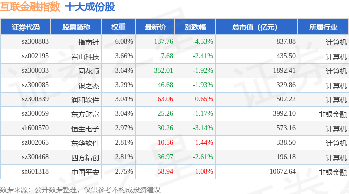 证券之星消息,11月4日,互联金融(399805)指数报收于3964.11点,跌1.3%,成交500.87亿元,换手率1.41%。当日该指数成份股中,上涨的有15家,神州信息以5.04%的涨幅领涨,下跌的有49家,指南针以4.53%的跌幅领跌。