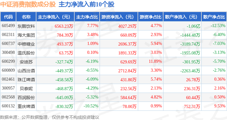 资金流向方面,中证消费(399932)指数成份股当日主力资金净流出合计18.15亿元,游资资金净流入合计10.59亿元,散户资金净流入合计7.55亿元。成份股资金流向详情见下表: