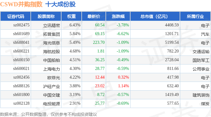 证券之星消息,11月4日,CSWD并购(399992)指数报收于2144.68点,跌1.17%,成交527.08亿元,换手率2.3%。当日该指数成份股中,上涨的有20家,粤传媒以10.01%的涨幅领涨,下跌的有75家,拓普集团以6.62%的跌幅领跌。