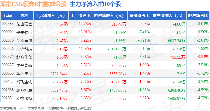 资金流向方面,深指ESG领先R(470029)指数成份股当日主力资金净流出合计226.06亿元,游资资金净流入合计59.34亿元,散户资金净流入合计166.72亿元。成份股资金流向详情见下表: