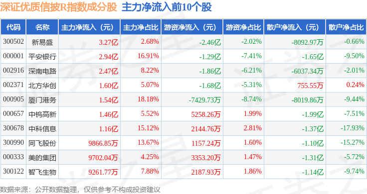资金流向方面,深证优质信披R(470065)指数成份股当日主力资金净流出合计262.72亿元,游资资金净流入合计75.3亿元,散户资金净流入合计187.42亿元。成份股资金流向详情见下表: