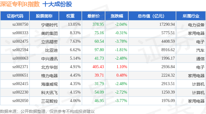 深证专利R(470067)指数十大成份股详情如下: