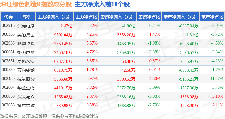 资金流向方面,深证绿色制造R(470069)指数成份股当日主力资金净流出合计97.75亿元,游资资金净流入合计25.37亿元,散户资金净流入合计72.38亿元。成份股资金流向详情见下表: