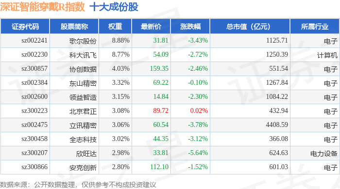 深证智能穿戴R(470074)指数十大成份股详情如下: