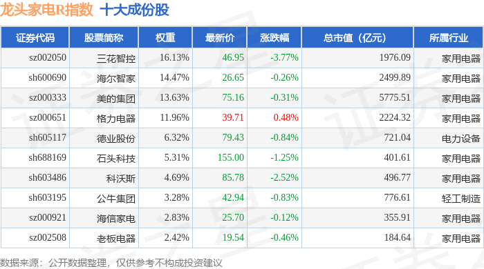 龙头家电R(480028)指数十大成份股详情如下: