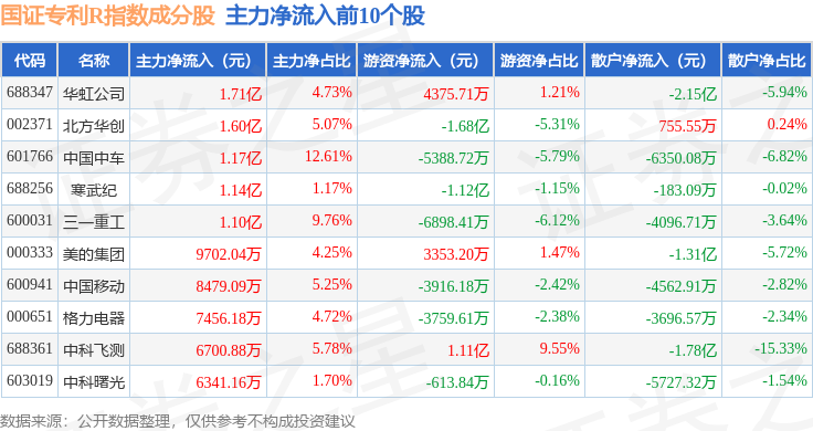 资金流向方面,国证专利R(480070)指数成份股当日主力资金净流出合计128.45亿元,游资资金净流入合计35.62亿元,散户资金净流入合计92.83亿元。成份股资金流向详情见下表: