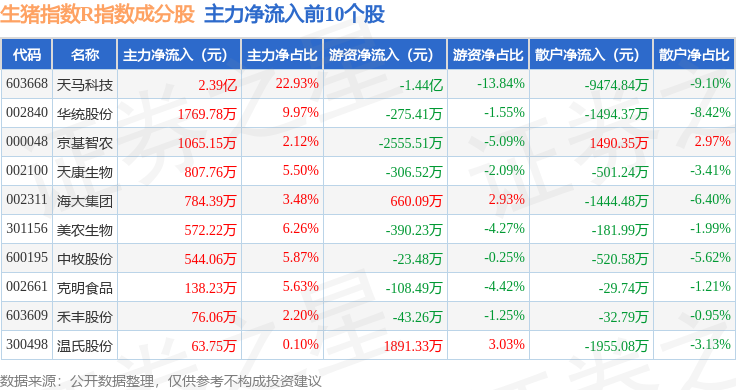 资金流向方面,生猪指数R(480073)指数成份股当日主力资金净流出合计2.93亿元,游资资金净流入合计1.05亿元,散户资金净流入合计1.89亿元。成份股资金流向详情见下表: