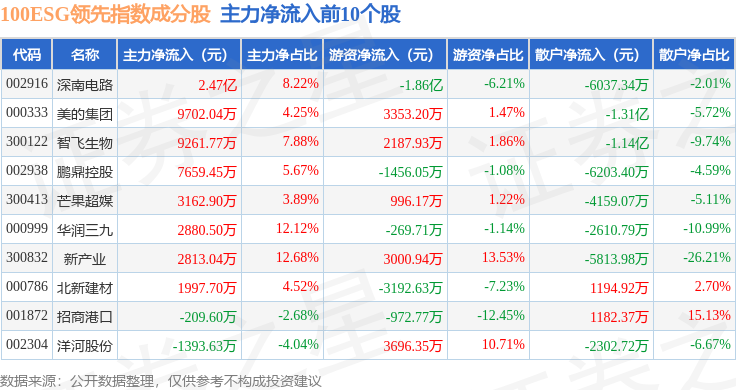 资金流向方面,100ESG领先(970030)指数成份股当日主力资金净流出合计133.79亿元,游资资金净流入合计33.63亿元,散户资金净流入合计100.16亿元。成份股资金流向详情见下表: