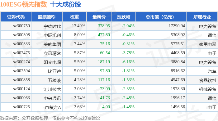 证券之星消息,11月4日,100ESG领先(970030)指数报收于6543.87点,跌2.04%,成交1355.46亿元,换手率1.22%。当日该指数成份股中,上涨的有7家,智飞生物以2.8%的涨幅领涨,下跌的有43家,阳光电源以6.16%的跌幅领跌。