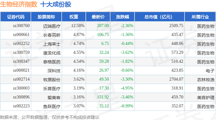 证券之星消息,11月4日,生物经济(970038)指数报收于2237.98点,跌1.75%,成交227.08亿元,换手率1.47%。当日该指数成份股中,上涨的有6家,华兰疫苗以11.75%的涨幅领涨,下跌的有44家,康弘药业以6.79%的跌幅领跌。