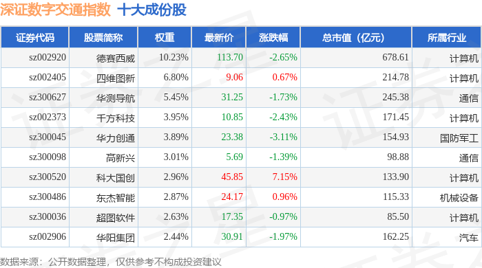资金流向方面,深证数字交通(970049)指数成份股当日主力资金净流出合计10.27亿元,游资资金净流入合计2.49亿元,散户资金净流入合计7.79亿元。成份股资金流向详情见下表: