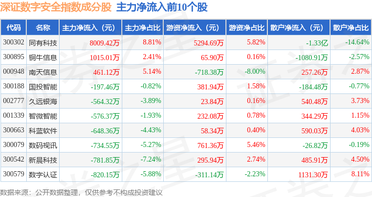 资金流向方面,深证数字安全(970052)指数成份股当日主力资金净流出合计28.28亿元,游资资金净流入合计6.67亿元,散户资金净流入合计21.61亿元。成份股资金流向详情见下表: