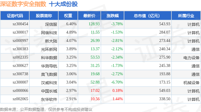 证券之星消息,11月4日,深证数字安全(970052)指数报收于3606.08点,跌1.87%,成交312.75亿元,换手率4.12%。当日该指数成份股中,上涨的有9家,神州信息以5.04%的涨幅领涨,下跌的有41家,汉威科技以6.7%的跌幅领跌。