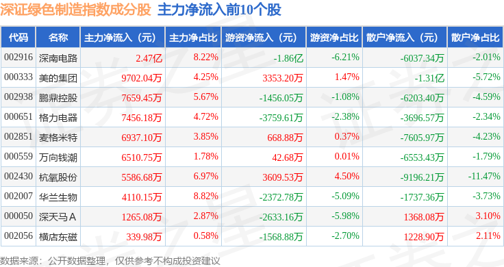 资金流向方面,深证绿色制造(970069)指数成份股当日主力资金净流出合计97.75亿元,游资资金净流入合计25.37亿元,散户资金净流入合计72.38亿元。成份股资金流向详情见下表: