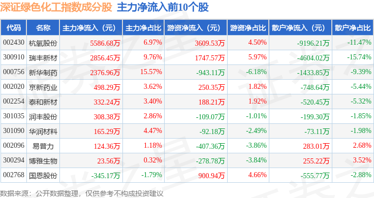 资金流向方面,深证绿色化工(970076)指数成份股当日主力资金净流出合计35.67亿元,游资资金净流入合计7.1亿元,散户资金净流入合计28.57亿元。成份股资金流向详情见下表: