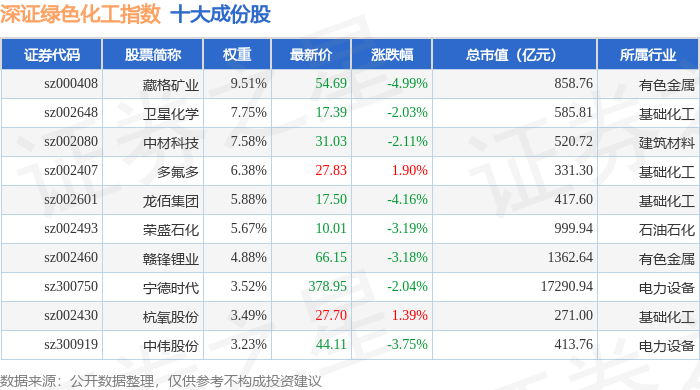 证券之星消息,11月4日,深证绿色化工(970076)指数报收于1570.87点,跌2.32%,成交375.21亿元,换手率1.81%。当日该指数成份股中,上涨的有4家,多氟多以1.9%的涨幅领涨,下跌的有46家,瑞丰新材以6.27%的跌幅领跌。